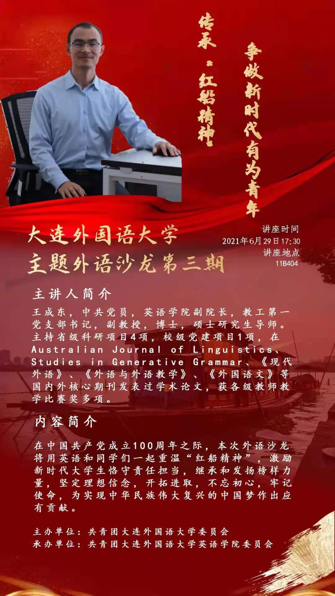 本期沙龙我们将邀请娱乐游戏平台大全 副院长王成东老师,带领同学们用英语重温“红船精神”,围绕此进行讨论与分享。