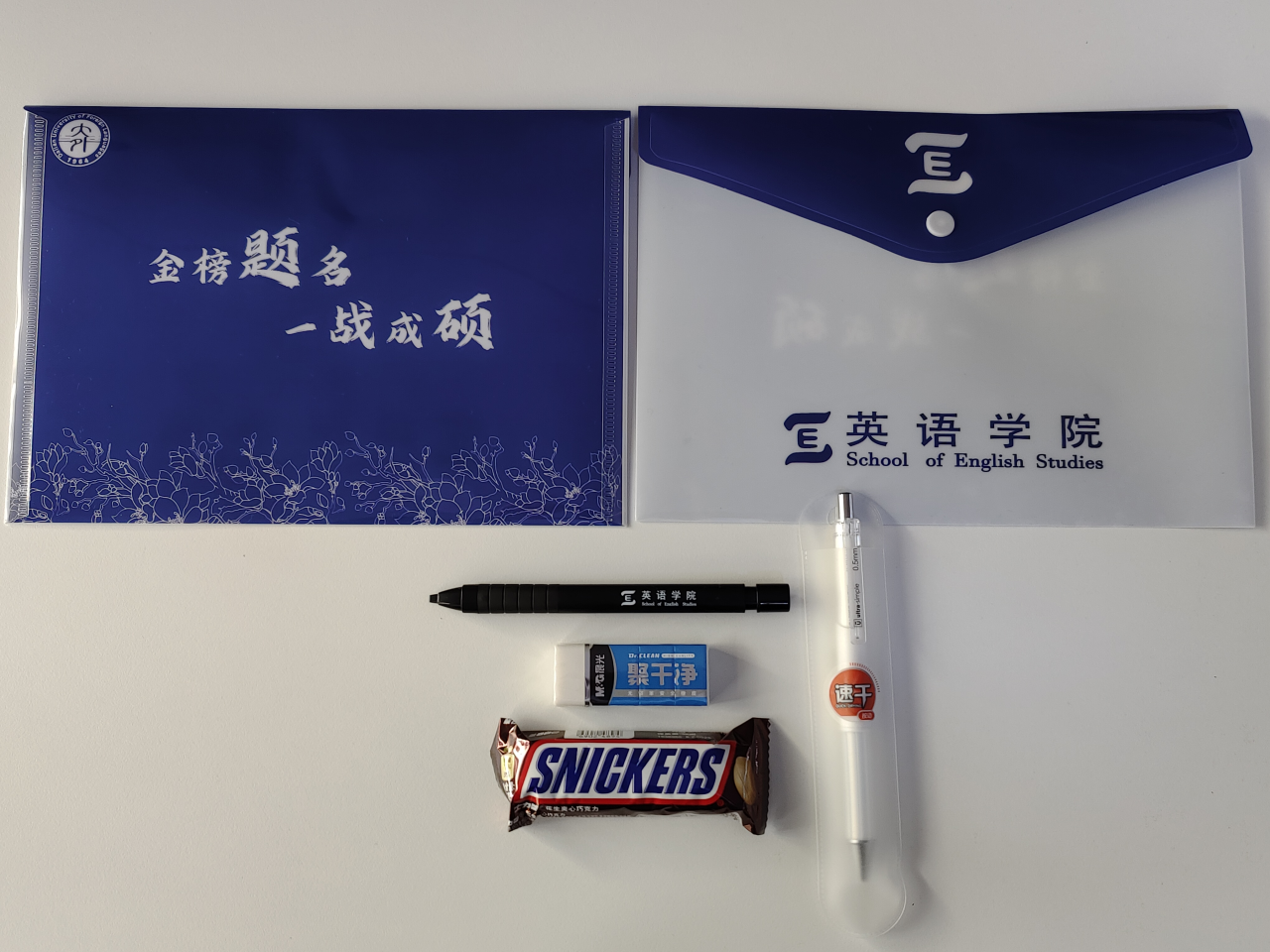 会议伊始,辅导员王艺凝老师向同学们介绍了学院精心准备的“考研加油包”:一支黑色中性笔、一支定制涂卡笔、一块橡皮,既方便实用的同时又希望大家答题顺利,笔下生花;一块士力架巧克力,愿为同学们补充能量,助力学子们扬帆起航;还有一个印有学校和学院logo以及校花玉兰花的文件袋,向大家生动地展示着“金榜题名,一战成硕”的美好祝福!动员会现场的加油包摆成了“E·2024”的字样,其中每一份加油包都传递着老师们对2024届毕业生顺利考研上岸的真挚祝愿和期许。