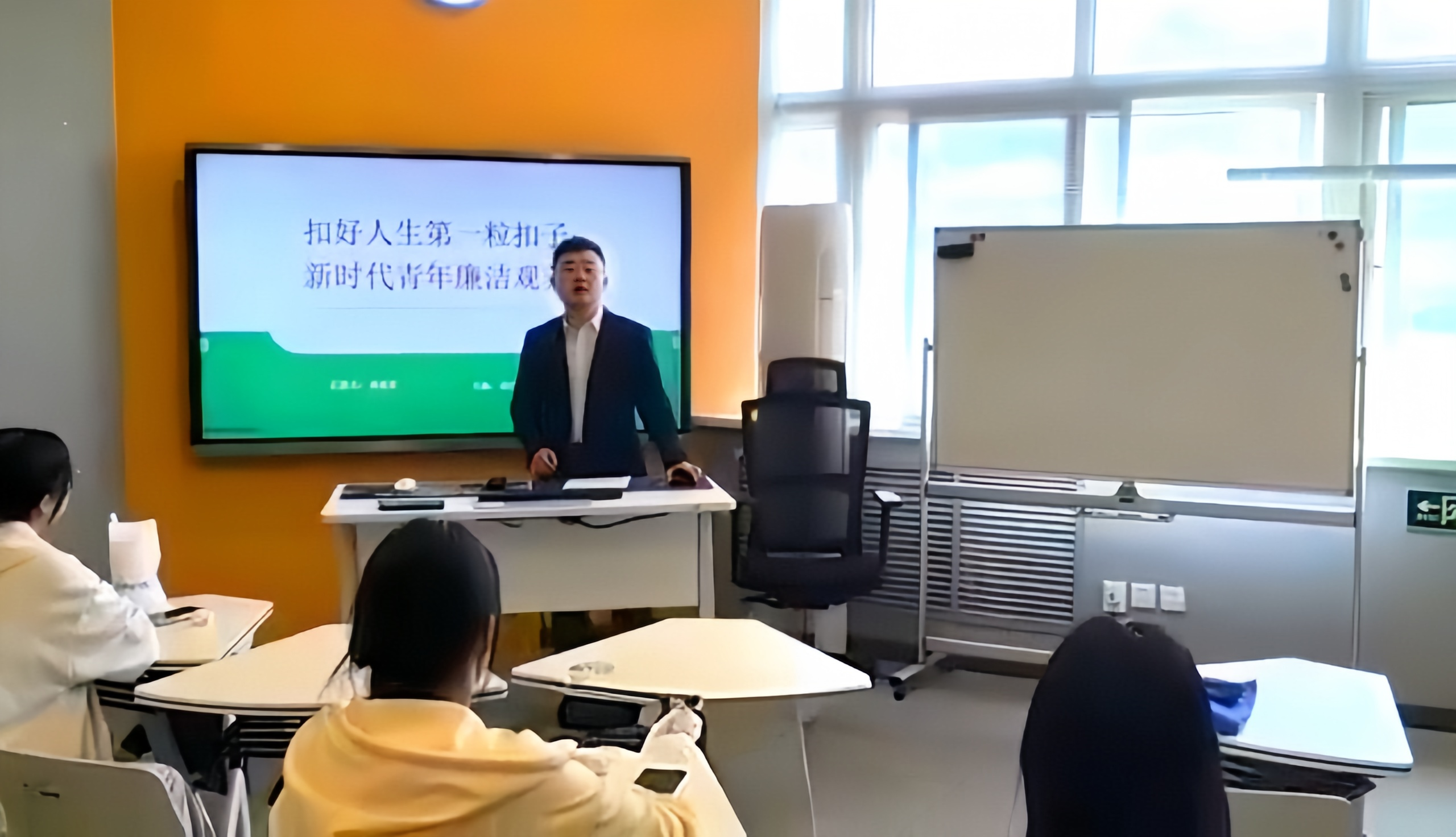 团委书记曲镜达于VR实训中心为入团积极分子带来团课第二讲课程。本次课程主题为“扣好人生第一粒扣子:新时代青年廉洁观养成”。本次课程聚焦廉洁观的内涵与养成路径,从“廉洁观的时代价值”“青年面临的廉洁风险”及“实践养成方法”三大维度展开讲解。曲镜达老师结合青年群体特点,剖析了廉洁观对个人品德塑造、社会风气引领及国家长远发展的深层意义,引导学生在虚拟实践中强化责任担当与诚信意识。最后,曲镜达老师希望新时代青年应以“公正无私”“勤俭节约”等传统美德为锚点,主动抵制消费攀比、学术不端等现实挑战,将廉洁自律融入学习生活与未来职业选择。