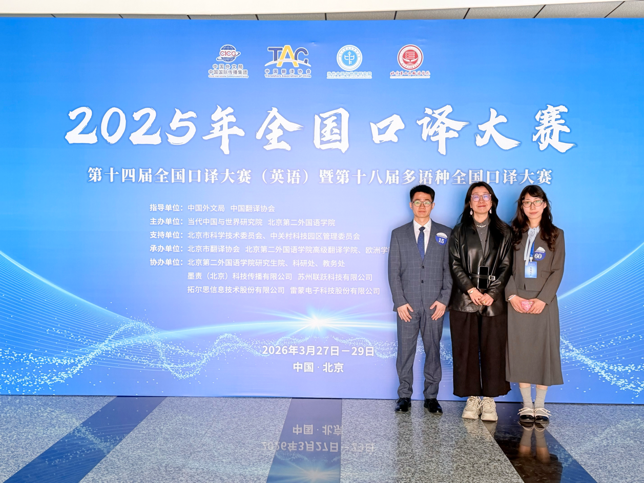 3月27日—29日,第十五届全国口译大赛全国总决赛在北京第二外国语学院圆满落幕。作为国内口译领域极具影响力的专业赛事,本届大赛吸引了全国百余所高校选手同台竞技,比拼内容涵盖语言功底、临场反应、逻辑表达与跨文化传译能力,竞争十分激烈。我院学子凭借稳定发挥与扎实实力,斩获多项荣誉,创下学院在该项赛事中的历史佳绩。