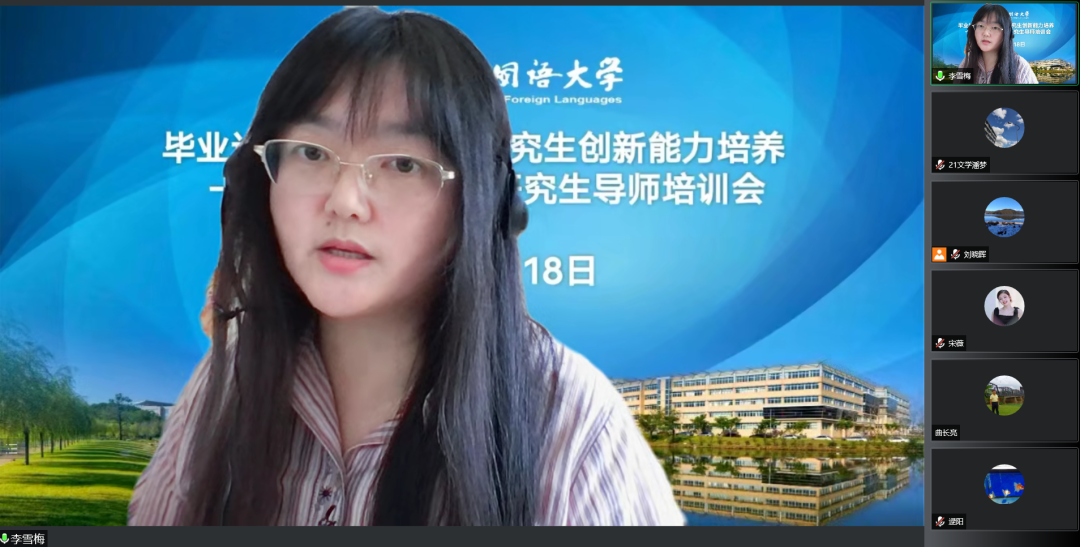 首先,刘晓晖副院长总结了我院2022届研究生毕业论文外审及答辩总体情况,充分肯定我院研究生导师的辛勤付出,同时根据现存的不足与问题明确我院未来研究生培养工作的重点和方向。接下来,孙鑫、李文萍、李雪梅三位导师代表结合自己的指导经验,分享指导研究生成长成才的有效方法。孙鑫教授从师生关系、论文指导、学术发展等方面强调了师生合作共赢、全面立体培养、尊重学生个人规划、导师学术引领的重要性。李文萍教授从论文研讨发表、培养学术自信、拓展学术视野、关注学生心理健康等方面介绍了研究生论文质量提升与高层次人才培养的途径。最后,李雪梅副教授从情感支持、学术论文发表、学术引领、论文质量把控等方面强调了建立良好的师生关系以及树立学术榜样的重要性,同时指出导师要加强对培养过程的监督管理,严把研究生毕业论文质量关。
