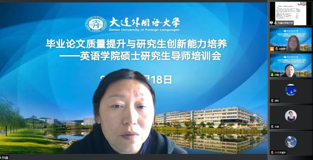 经验交流环节结束后,在英语文学、翻译研究、理论语言学、应用语言学四个方向线上分会场,导师们围绕本次会议主题进行了深入交流与讨论。曲涛副院长、刘晓晖副院长、林璐教授、孙鑫教授分别主持了分组讨论。各组对毕业论文框架及学术规范进行了统一,同时针对研究生招生选拔、毕业论文选题、论文质量提升、创新思维培养等问题集思广益,碰撞智慧,在很多方面形成一致性意见,进一步明晰了学术型研究生培养的有效途径。