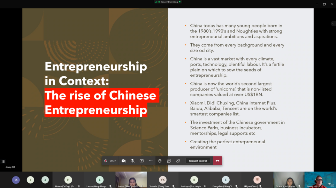 邀请爱尔兰国家学院副校长Jimmy Hill教授为商务英语专业本科生讲授《创业导论》课程。本次课程全程采用线上方式授课。