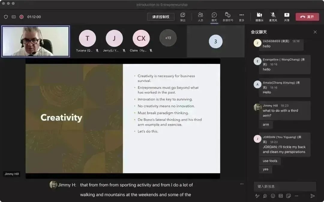 在授课过程中,Jimmy Hill教授从研究和实践两方面出发,引导学生深入思考如何将创新和创业有效融入专业学习之中,树立更加符合时代要求的新型学习目标。同时,他带领学生从社会心理学和行为学角度分析创业精神,探讨创业能力框架的各个元素,并运用具体案例深度阐明创造力、创新与创业之间的关系。