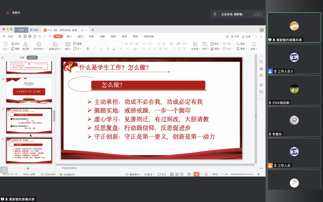 课堂伊始,黄新智老师详细讲解了党的宗旨与学生工作之间的关系,带领同学们认真研读了党的二十大报告中习近平总书记对青年的勉励,为同学们学习、工作和人生方向提供了积极的理论指导。