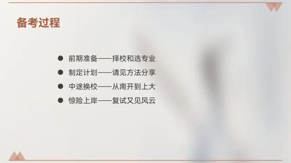 首先,成功考取河南大学学科教学(英语)专业的张兰天同学讲述了自己选专业和择校的经历,并强调了效率、心态、选择的重要性。其次,调剂至上海电力大学的于梦同学则介绍了翻译硕士不同考试科目的学习方法,尤其分享了调剂的流程及经验。而后,从退伍军人蜕变至优秀大学生,并最终跨考至上海大学图书情报专业的任永前同学讲述了自己一波三折但锲而不舍的奋斗经历,并将个人备考秘籍倾囊相送,供同学们借鉴学习。紧接着,考取东北财经大学国际商务专业的吴沛泽同学分享了跨专业考研经验,详细分析了国际商务专业的未来就业方向。最后,成功申请西交利物浦大学国际化教育专业的赵梓妤同学为同学们提供了考研的另外一个途径——中外合作院校硕士项目,并就西交利物浦大学的基本概况、申请条件、以及毕业生流向等关键信息进行了介绍与讲解。