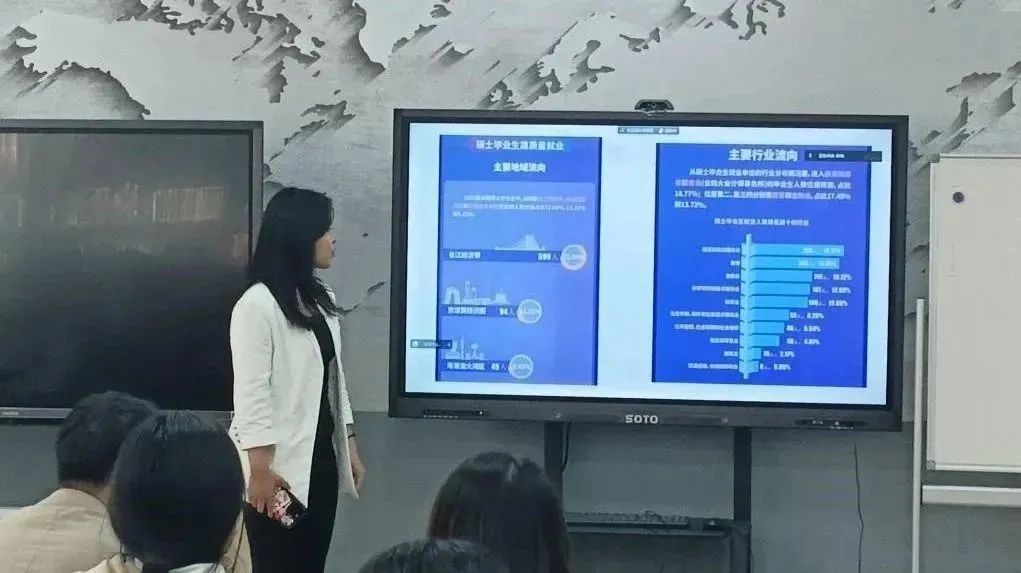 高宏惠和刘俊秀两位同学从就业角度出发,分别以外企和国内大厂两类就业去向作经验分享。首先,高宏惠同学介绍了亚马逊中国公司求职经验和收获,详细介绍了简历制作的要点与重点,强调根据心仪岗位有针对性精心打磨,最大限度展示自身优势。随后,刘俊秀同学着重介绍了本土企业学而思的入职感受和未来规划,分享了心得体会以及在工作中的不足,指出清晰定位目标、及时总结失误、不断提升业务能力的重要性。同时,刘俊秀同学基于数据分析了当前就业趋势,鼓励同学们尽早做好职业规划。