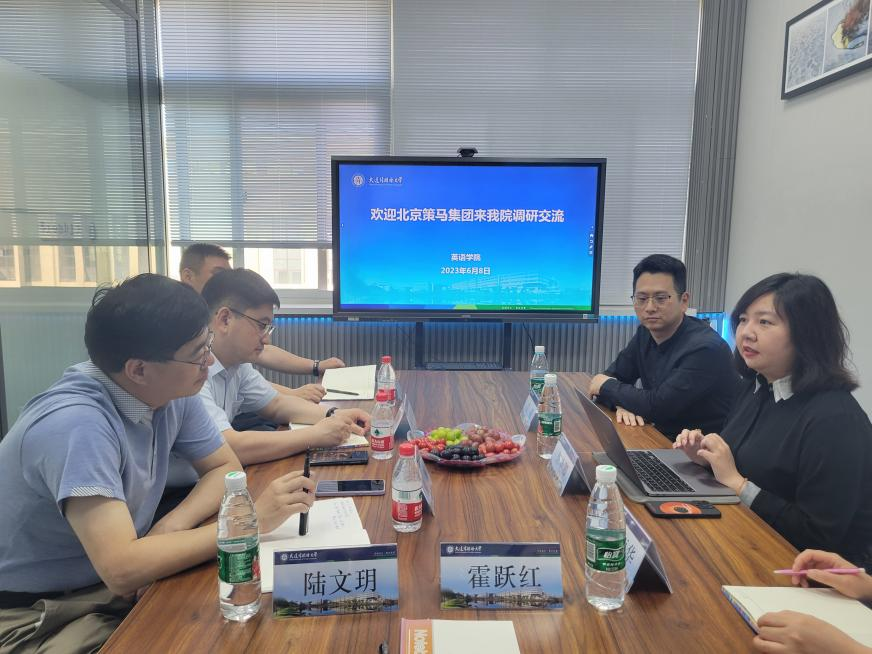 领导班子和教师代表霍跃红教授、刘振华老师和陆文玥老师,在励业楼丹若沐和风工作室与北京策马集团总经理文毅和副总裁助理郭艳卿举行座谈。双方围绕学科专业建设、师资联培、校企合作、课程共建和英语专业翻译人才和商务英语专业人才培养等方面深入交流,重点对依托英语专业人才资源,开拓跨境电商和数字贸易就业市场进行了热烈探讨。