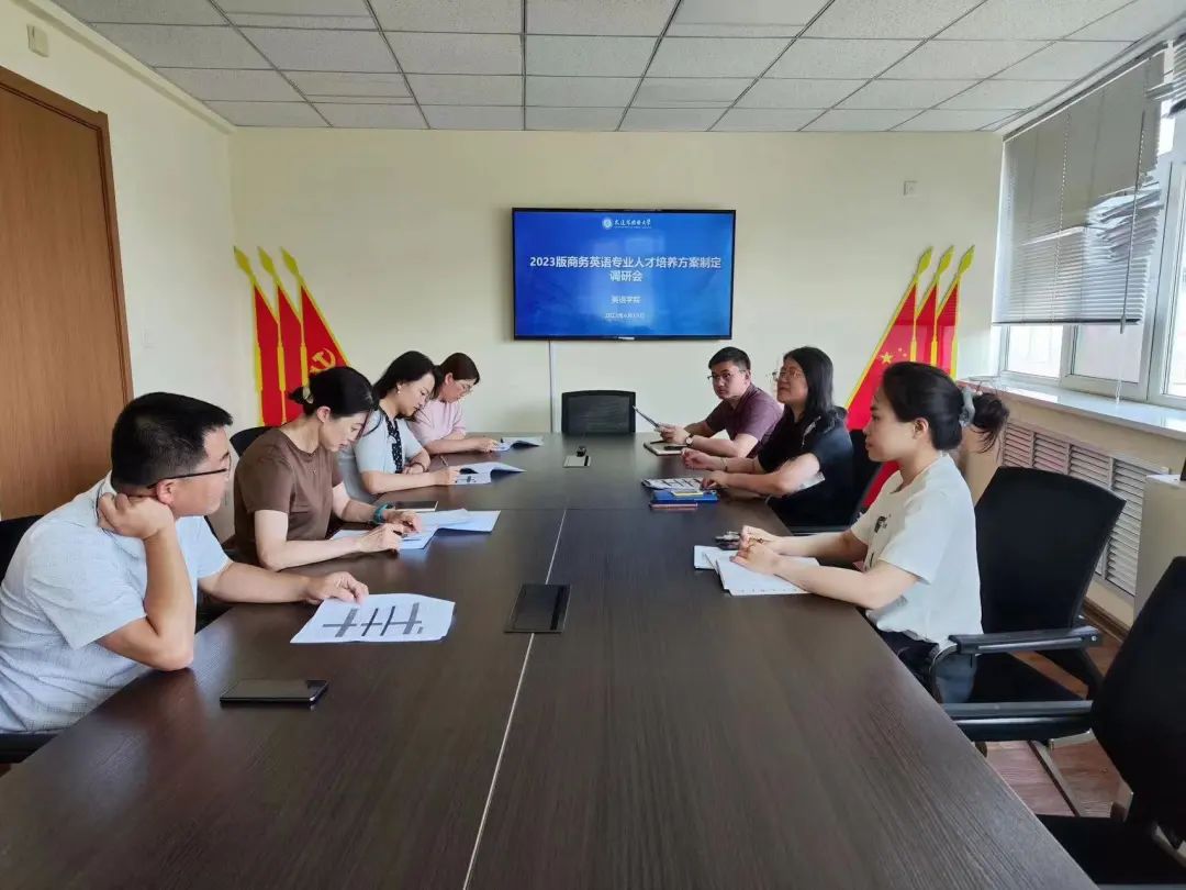 召开2023版商务英语专业人才培养方案编制调研会。会议由副院长刘晓晖主持,学院党委副书记梁若冰、商务英语高年级教研室主任于红霞以及商务英语专业方向课程主讲教师参加了调研会。