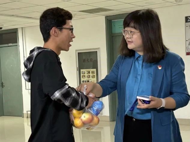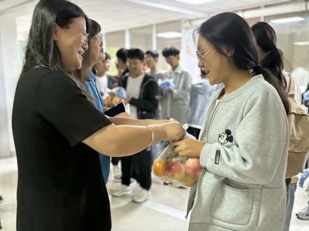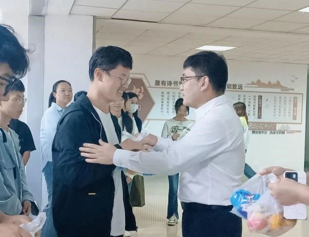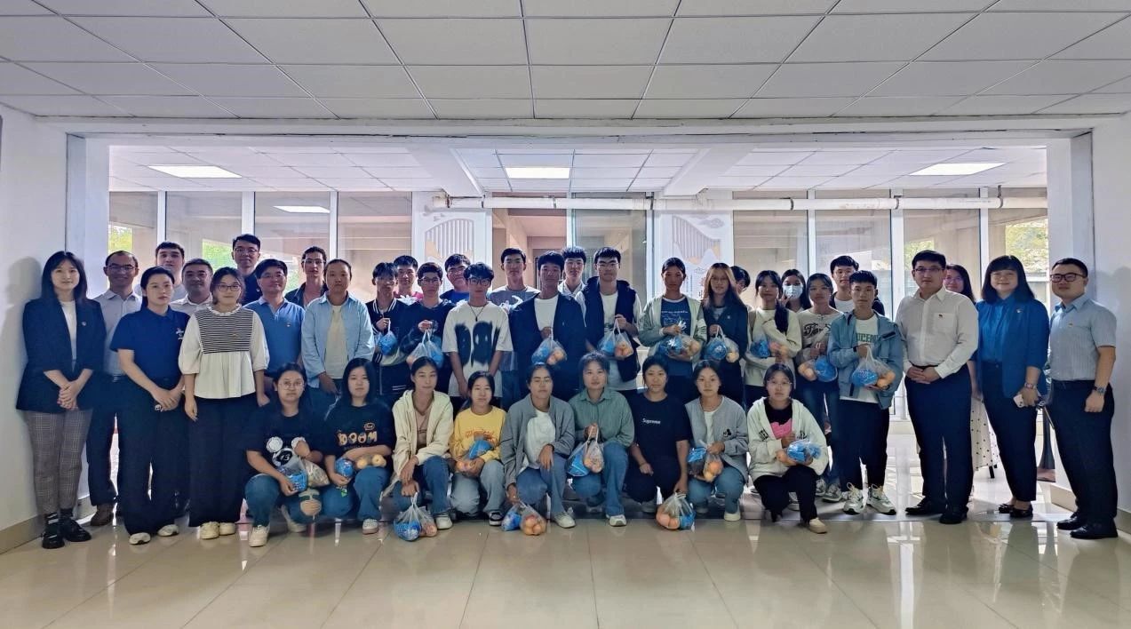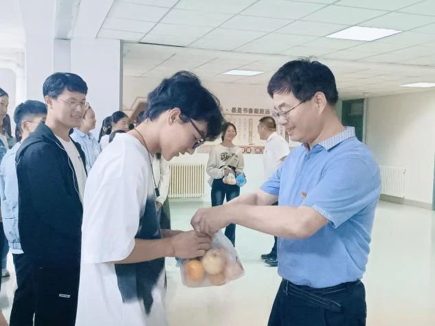 领导教师分发了节日慰问品,为同学们送上了中秋节和国庆节的“双节”祝福,并与同学们合影留念。