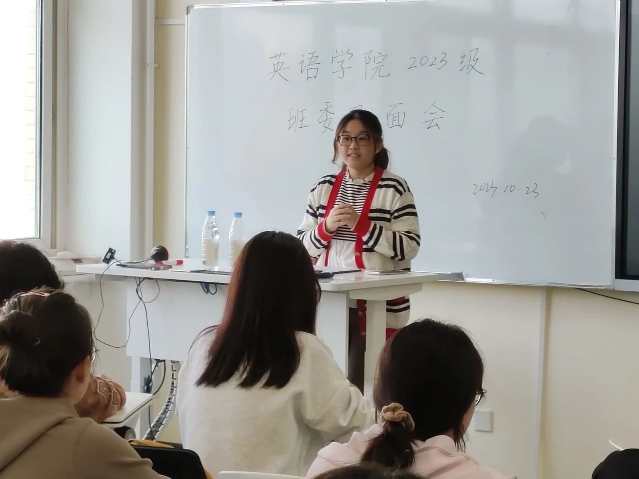 在班委见面会上,曲镜达老师与吴曼老师首先向各位班委表达了由衷的祝贺。在谈及今后的班级工作问题时,曲镜达老师提出班委要注意成绩、能力、态度三点,并指出各班委虽分工不同,但仍要作为一个整体运转来为班级服务。此外,吴曼老师强调一个合格的班委不仅要具备服务意识,更要从日常的言行举止到工作中的态度作风对同学们起榜样带头作用。