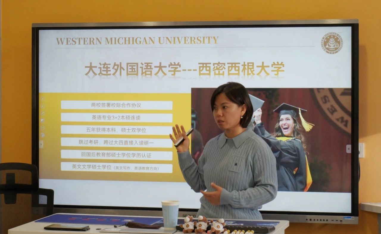 首先,杜老师详细介绍了美国西密西根大学的概况,包括地理位置、学校排名、学校荣誉、科研状况、实习机会以及其所在的密歇根州等相关信息。接着杜老师介绍了大连外国语大学与美国西密西根大学的联合培养项目,并对美国西密西根大学的入学要求、奖学金情况、培养项目的申请要求和相关流程进行了详细说明。随后,曾主任与同学们进行了互动交流,对大家关心的问题进行了耐心解答,并进一步向同学们介绍了美国西密西根大学的师资队伍、专业设置、科研成就、院校合作、实习实践等情况,展示了西密西根大学浓厚的学习氛围、丰富的校园活动、优美的周边环境、强大的科研实力和宝贵的公司实习机会。最后,曾校长鼓励有留学想法的同学尽早作好准备,清晰自己的未来规划,把握自我提升的机会,提升就业竞争力。