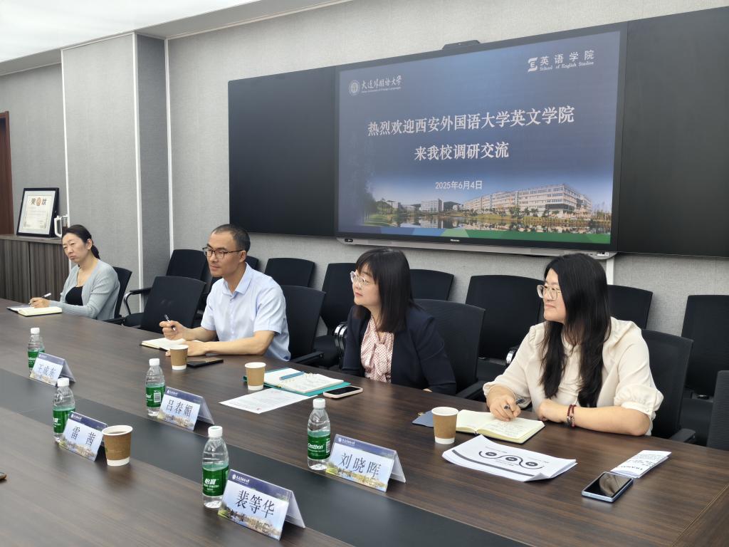 的基本情况。刘晓晖副院长从学术与实践两方面分享了学院在研究生人才培养方面的成果与特色。王成东副院长介绍了学院科研机构建设以及青年教师培养等方面的经验。西安外国语大学英文学院雷茜副院长高度评价我院在学科融合与创新实践方面取得的成效,并介绍了西外“1+X+Y”人才培养框架。座谈会上,双方还就国际交流、师资队伍建设、学科建设等领域存在的共性问题展开交流。