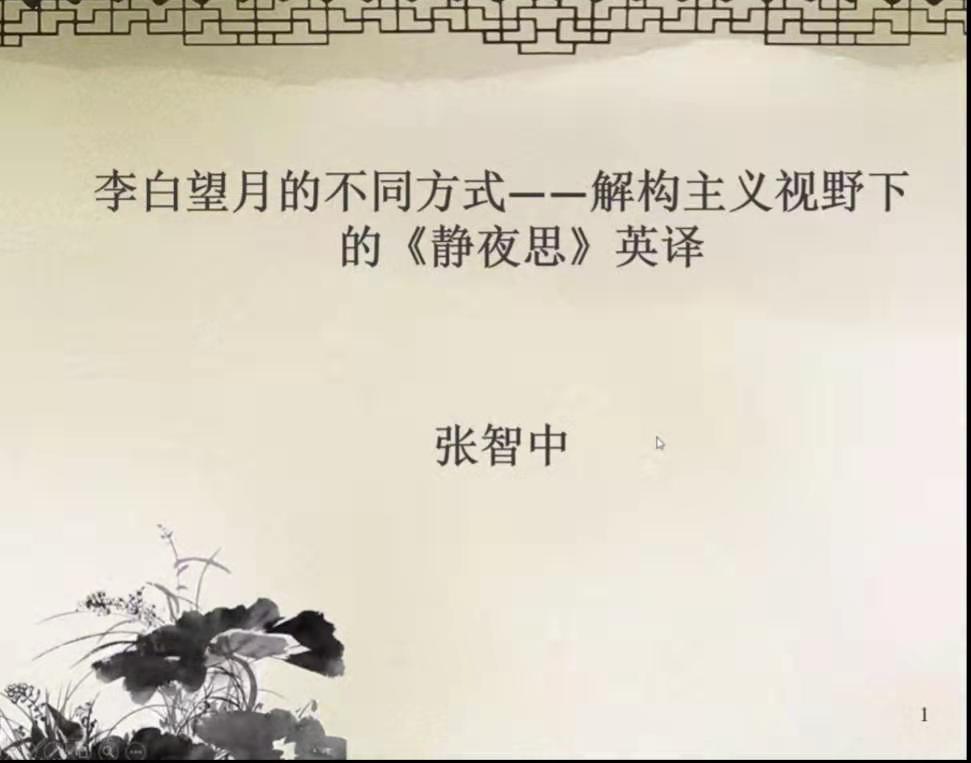 邀请,通过腾讯会议平台为我院做了题为“李白望月的不同方式——解构主义视野下的《静夜思》英译”的学术讲座。本次讲座为我院翻译系列讲座之一,由霍跃红教授主持,我院硕士研究生和翻译方向本科生共同聆听了此次讲座。