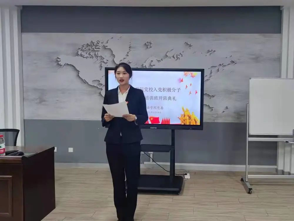 开班典礼伊始,2020级2班刘晓晗同学代表本次参加培训的全体学员进行发言。她表示,中国共产党的发展是一段艰苦又光辉的旅程,而作为入党积极分子,同学们更要虚心接受党组织的培养,努力向其靠拢。接下来,刘晓晗同学代表全体入党积极分子向党组织做出庄严承诺,在以后的学习与工作生活中,同学们定能在加强自我要求的同时,将中国共产党设立为自己的人生目标,刻苦努力、不断创新,争取早日成为一名合格的共产党员。