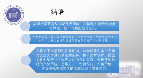 杨教授指出,在多元文化思潮的影响下,原先壁垒分明的界限已被打破,严肃文学与通俗文学的界限也越来越模糊,比较边缘的文学作品正逐步经典化,具有艺术生命力的作品以及思想深刻、观点独特的文学理论流派也逐渐确立了自己的文学传统。新历史主义、后殖民主义、种族批评和文化研究多模态等研究视角推动了文学研究的深化,生态批评、跨国界研究的出现又提供了不同的研究视角和方法,丰富了美国文学研究的范式。杨教授认为,美国文学研究从来都是界面的,关键是如何恰当地磨合界隙,把不同的面结合起来。在熟悉当前不同研究范式的同时,要密切关注当下文学批评的理论走向,以及人文社科领域各种文化思潮的衍变与发展。最后,杨教授呼吁中国学者在学术研究中要有中国立场,建设中国特色学术话语体系。