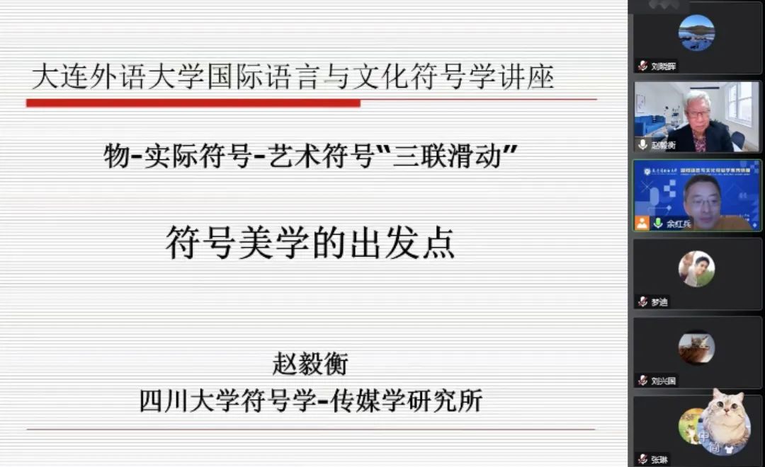 的邀请,通过腾讯会议平台为我院师生做了题为“物-实际符号-艺术符号‘三联滑动’:符号美学的出发点”的学术讲座。本次讲座为我院国际语言与文化符号学系列讲座之一,由大连外国语大学启航学者讲座教授、国际语言与文化符号学中心主任余红兵教授主持,我校部分教师、硕士研究生及本科生共同聆听了此次讲座。