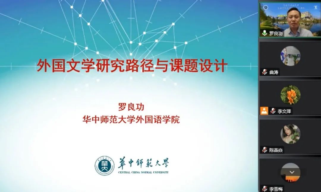 邀请,通过腾讯会议平台为我院师生做了题为“外国文学研究路径与课题设计”的学术讲座。本次讲座为我院“外语学科融合发展”高端云讲坛系列讲座之一,由李文萍教授主持,我院部分教师、硕士研究生及英语语言文学方向本科生共同聆听了此次讲座。