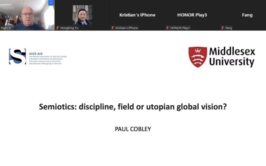 邀请,通过Zoom会议平台为我院师生做了题为“Semiotics: discipline, field or utopian global vision? ”的学术讲座。本次讲座为我院国际语言与文化符号系列讲座之一,由大连外国语大学启航学者讲座教授、国际语言与文化符号学中心主任余红兵教授主持,我院部分教师及硕士研究生共同聆听了此次讲座。