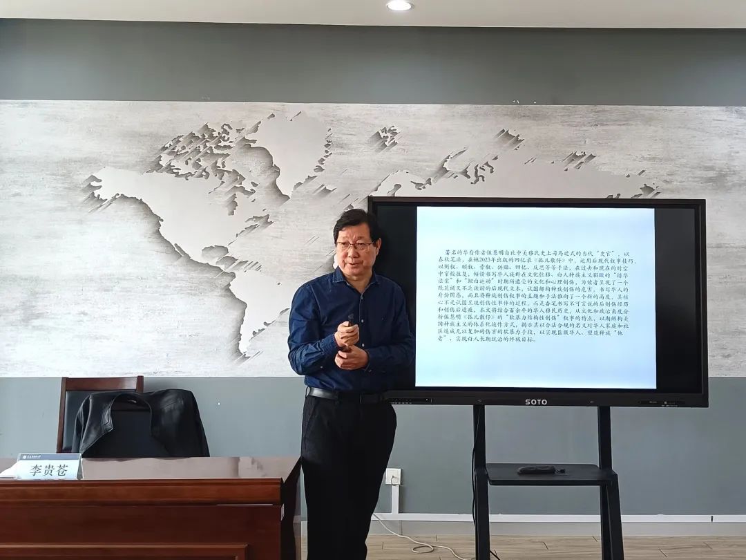 讲座伊始,李贵苍教授根据自身经验分享了正确的读书方式并指出了读书的目的在于知识创新。随后,李贵苍教授讲述了著名的华裔作者伍慧明自比中美移民史上司马迁式的当代“史官”,以春秋笔法书写回忆录,让大家深刻理解了海外华人百余年的生活方式及其依托国家的真实现状。最后,李贵苍教授从文化和政治角度着重分析了《孤儿散仔》中“非暴力结构性创伤”的特点,揭示了美国塑造种族“他者”以臣服华人,从而实现白人长期统治的终极目标。