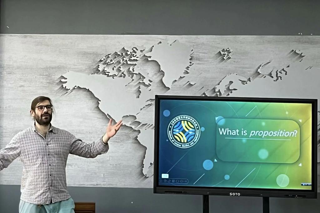 阿林·奥尔泰亚努教授首先用“什么是命题”“什么是隐喻”这两个疑问引入主题,并通过列举多样的语言实例,阐释命题符号理论及其对语言的研究和补充作用。此外,他还巧妙地穿插播放电影片段,将其运用到电影中的相关片段的分析中去。最后阿林·奥尔泰亚努教授借助具体语段实例,通过细致的分析,介绍了如何将其推广到其他媒体形式的多模态中。