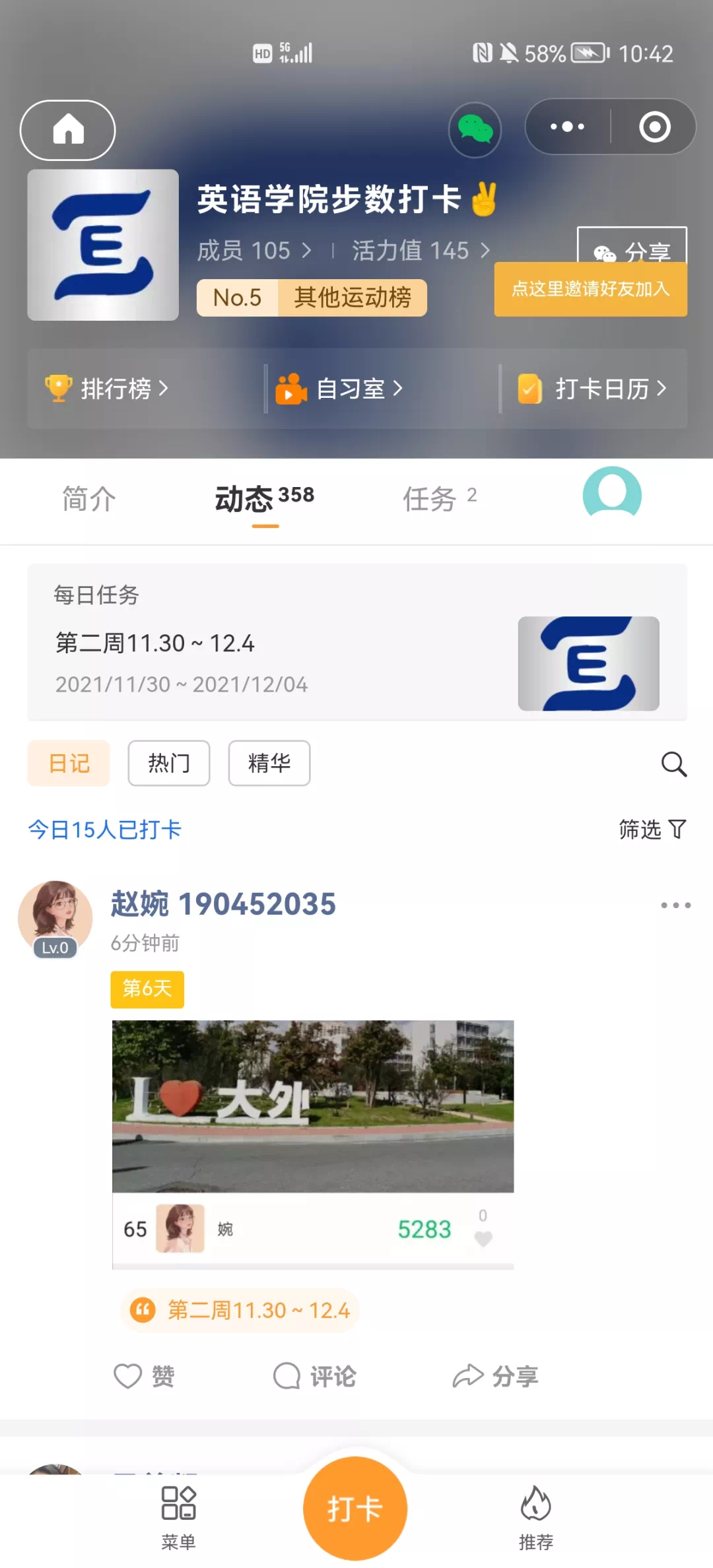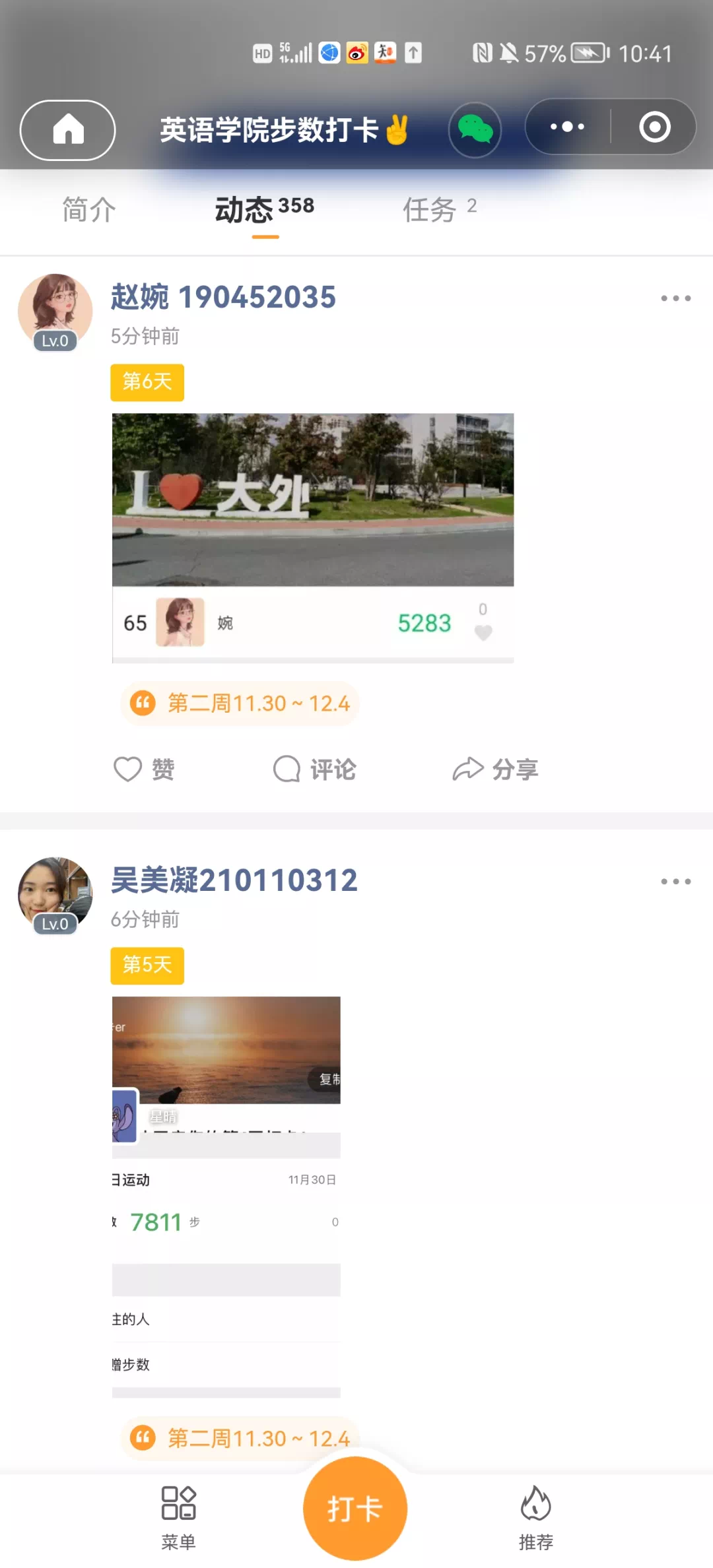 线上步数打卡活动和线下趣味活动相结合,积极开展“‘疫’中一条心,‘E’起动起来”主题趣味活动。运动是不会让人后悔的投资,当你爱上运动,健康也会爱上你。在网课期间,很多同学缺少锻炼,此次活动正激发了同学们锻炼体魄的热情,同学们的每一份坚持,每一份努力都在为良好的身体素质打下基础。