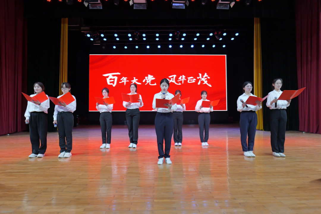 2020级本科生党员表演了红色精神主题朗诵,带领观众感悟百年来中国共产党人精神谱系新时代内涵。朗诵同学感情饱满,声情并茂,铿锵有力的诵读深深地打动了现场的每一位观众。