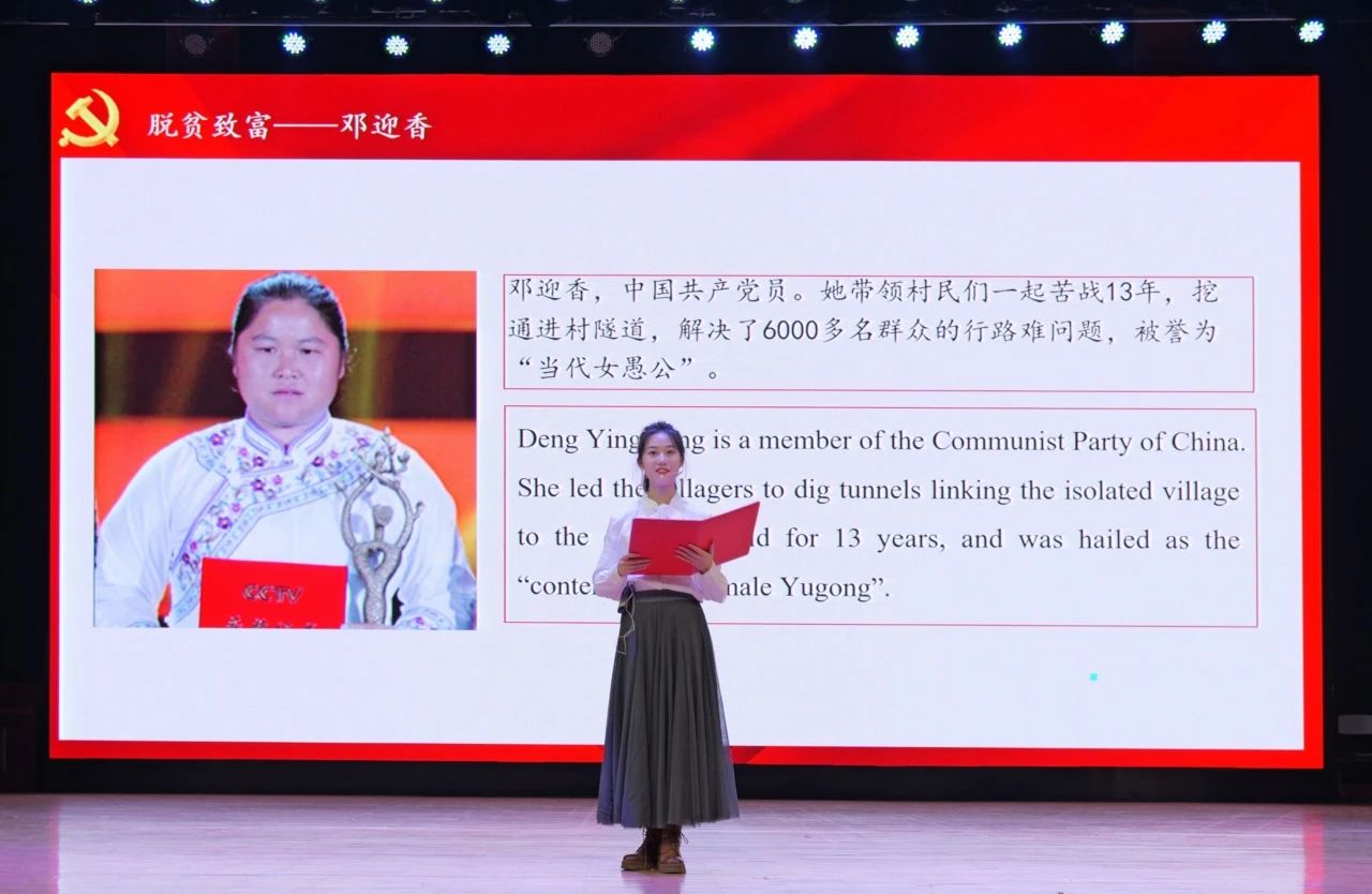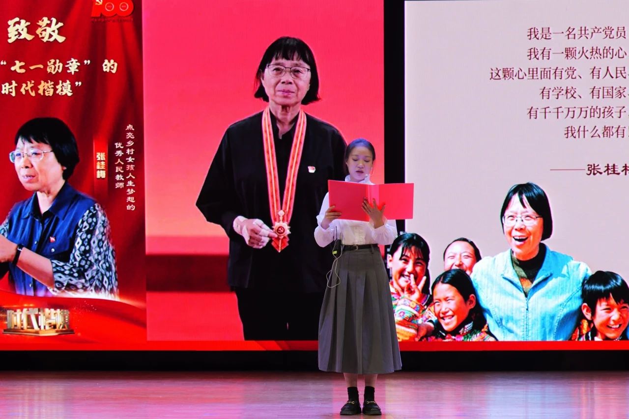 中场表演环节中,由蒋美轩、李昕睿、张依然、汪思齐、许博雅五位同学带来的朗诵《中华儿女多奇志,巾帼风华满庭芳》讲述了韦慧晓、邓迎香、叶嘉莹、张桂梅、叶叔华五个人物的感人事迹,向在各个领域为祖国无私奉献的中华巾帼致以最崇高的敬意。