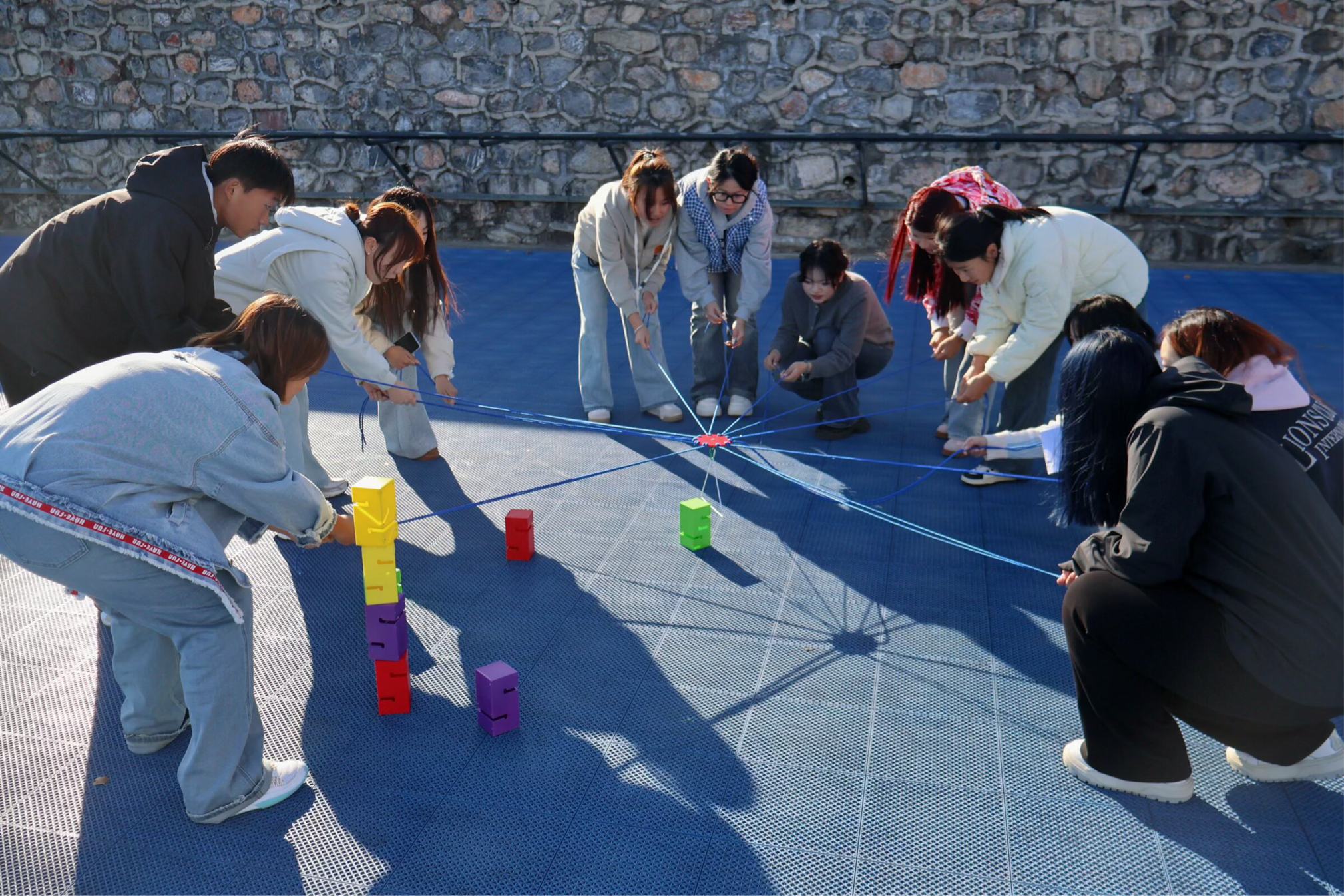 “万众一心”环节中,团干部和团员青年需要共同操控挂钩,将积木稳稳勾取并堆高,极大地考验了团队的耐心、专注与精密配合。