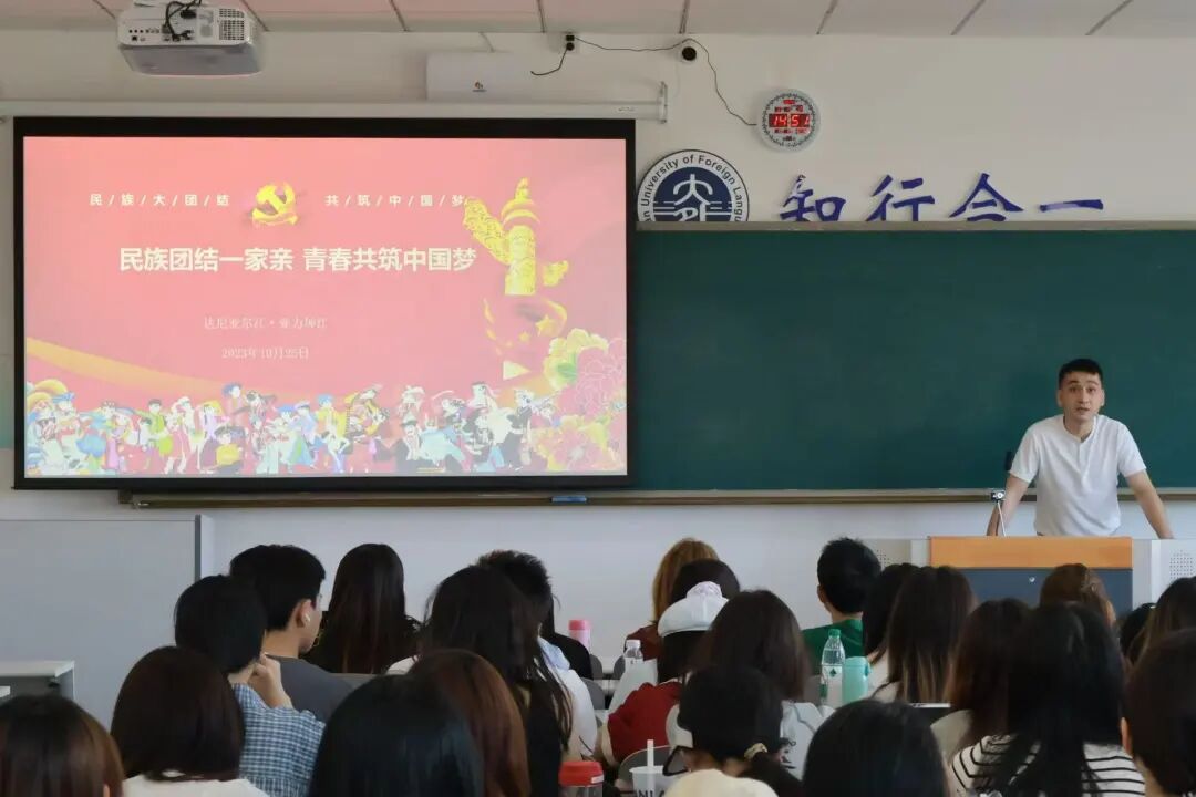 2021级辅导员达尼亚尔江·亚力坤江带来了《民族团结一家亲,青春共筑中国梦》专题课程。达尼老师从“什么是民族团结”“为什么要维护民族团结”“如何维护民族团结”三个维度展开,深入解读我国民族政策并阐释民族团结的内涵。他表示,民族团结是各民族人民的生命线,同时对维护国家稳定、促进社会发展具有重要意义。最后,达尼老师通过我校实践活动案例展现了民族团结的蓬勃生机,并鼓励大家自觉将认识转化为行动,踊跃投身实践,争做民族团结进步的坚定维护者。
