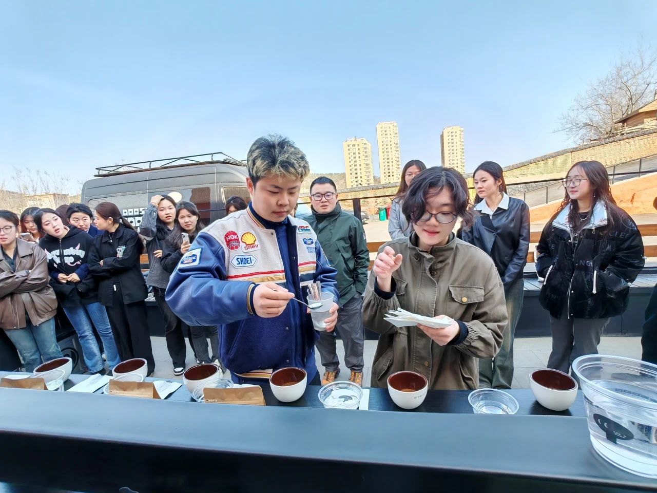 比赛之余,同学们在咖啡师的悉心指导下学习了咖啡的拉花技巧。同时,大家还发挥创意,进行了命题创作,将纸杯绘制成精美的艺术品。活动即将结束时,大家合影留念,定格了这难忘的时刻。