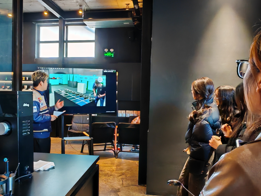 抵达咖啡工厂,首先由2019年KB90大连拉花城市赛冠军、PCA亚太地区人气王及PCA亚太地区决赛20强傅老师为大家做有关品牌介绍、咖啡点单、咖啡基本酸甜苦逻辑的科普分享。随后,讲解进入到更为专业的“杯测”知识,同学们了解了杯测规则及其对于咖啡烘焙生产的意义。