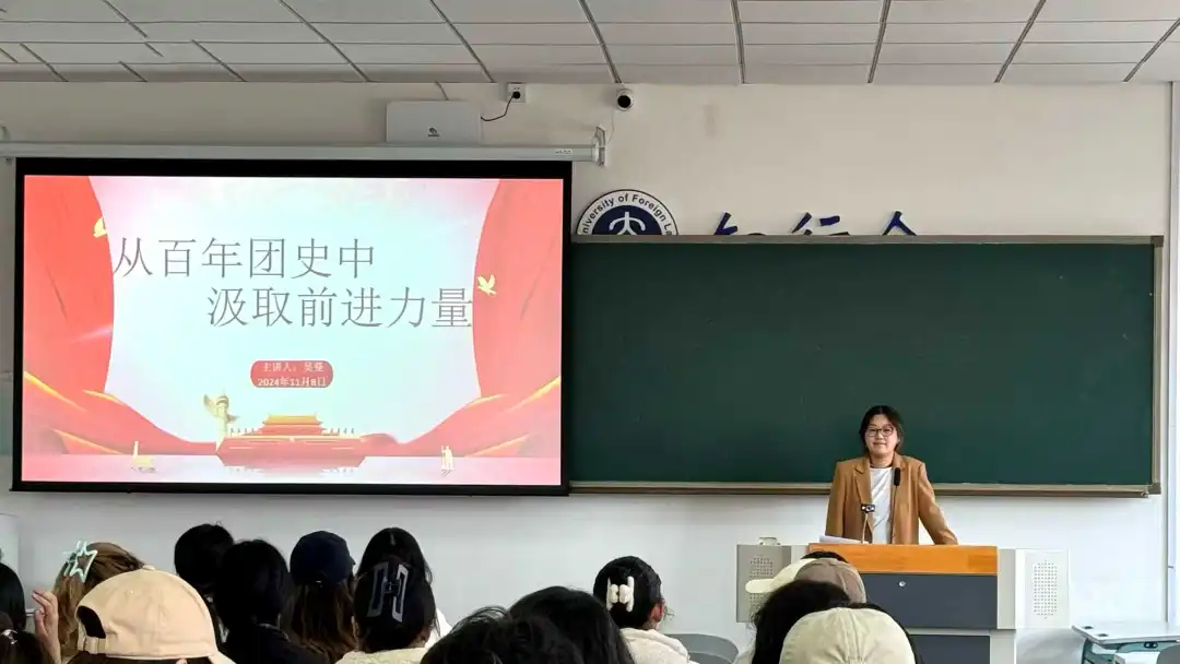 2023级辅导员吴曼为入团积极分子带来“从百年团史中汲取前进力量”专题课程。本次课程涵盖共青团的概况、共青团的发展历史以及共青团的先锋模范作用三方面内容。吴曼老师首先介绍了团的基础知识,并进一步解释了共青团员的义务与权利之间的辩证关系。同时,吴曼老师对共青团的光辉历史进行详细梳理,使入团积极分子对共青团发展的光辉历程有了更深刻的认知。“百年波澜壮阔,百年青春激昂,吾辈当自强”,这是吴老师对入团积极分子的深切期望,她列举多位青年楷模的模范事例,激励同学们在新时代赓续红色基因、传承红色精神,逐步成长为社会主义事业的合格建设者和可靠接班人。