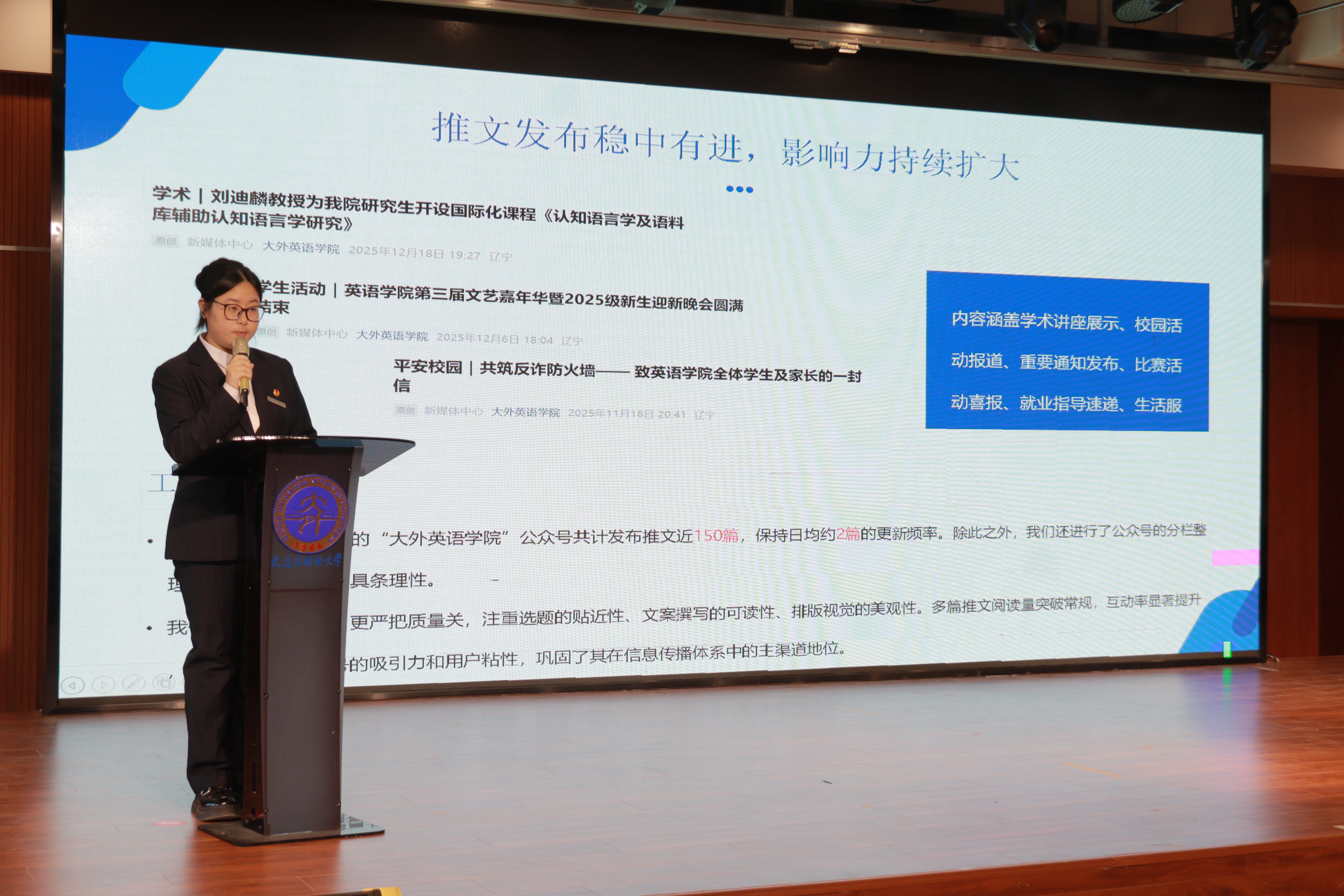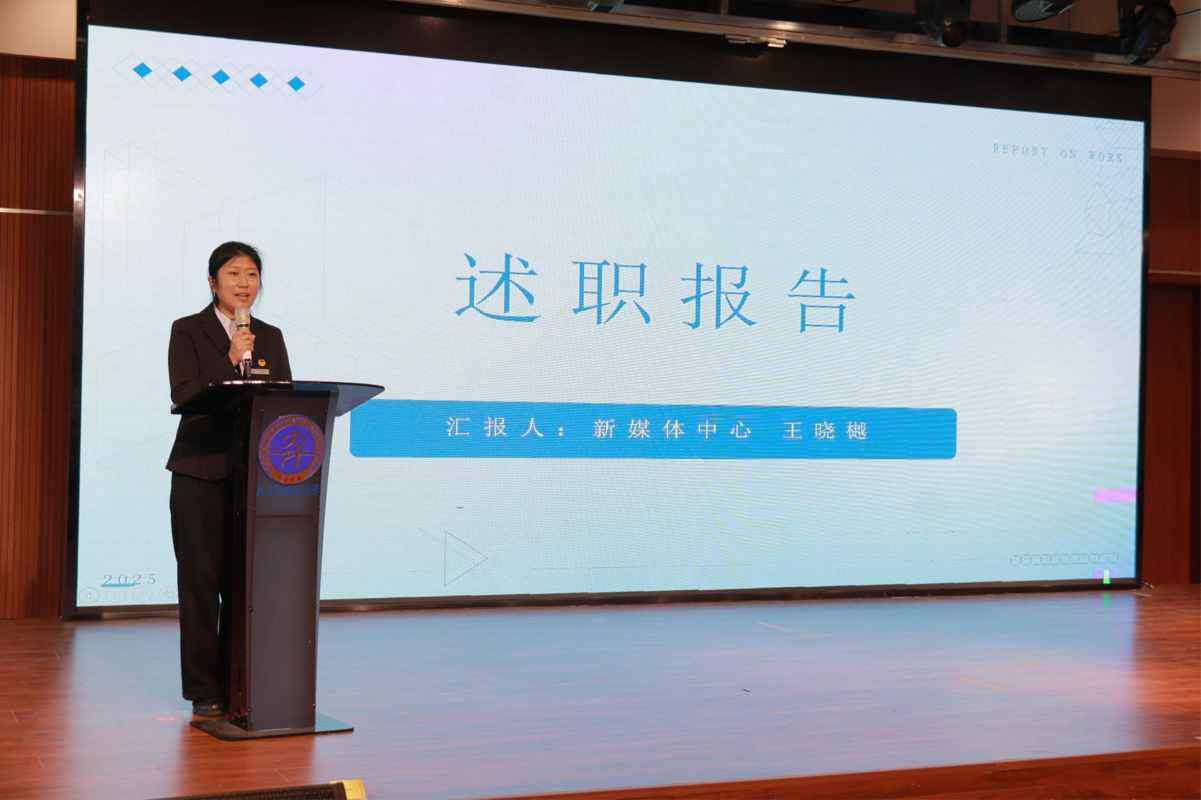 新媒体中心主任王晓樾分管文编部与摄影部,她在述职报告中复盘了公众号推文创作审核、校园活动影像记录等工作的完成质量。她表示将带领文编摄影团队深入挖掘学院故事,让推送更具感染力。