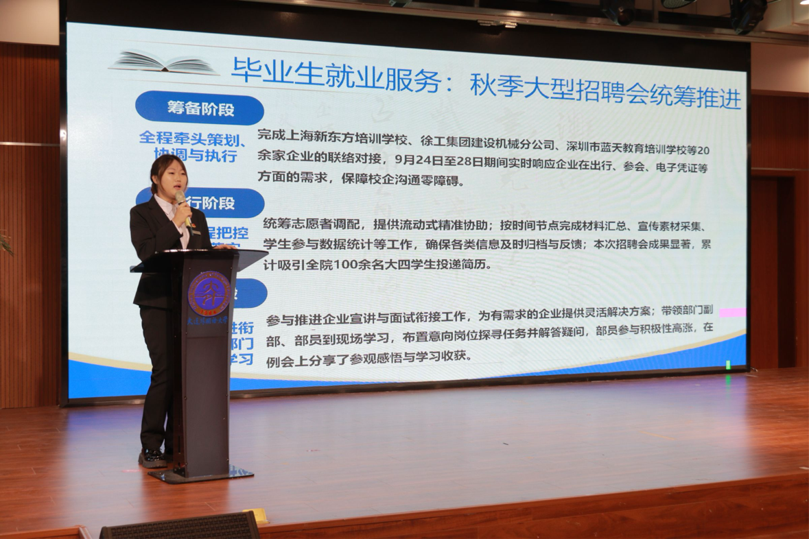 就业指导部部长殷雪围绕部门工作进行总结述职,重点介绍了招聘会与狮威物流杯赛事筹备等核心工作的开展情况。她表示将进一步整合就业资源,让就业指导服务更精准地对接学生需求。