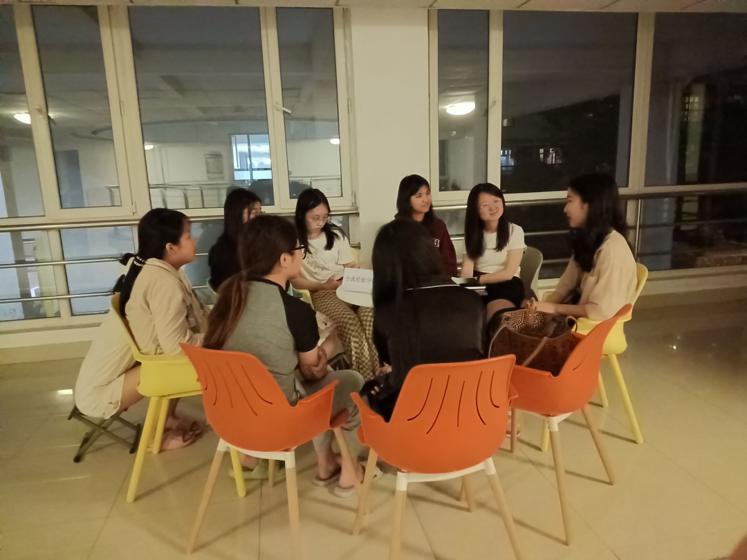 参与本次经验分享活动的五位2020级同学分别来自翻译、教育、国际商务管理、文学以及国别五个分流方向。五位同学充分准备,认真细致地向同学们讲解各分流方向的培养方案细则与课程体系设计,帮助同学们明确各专业方向未来的升学和就业形势,提示和指导同学们提前做好未来规划。同学们围坐在桌旁,认真倾听五位优秀学生代表对于分流的经验与建议。同时,针对同学们所选分流方向中遇到的问题,她们也进行耐心指导,一一进行答疑解惑。