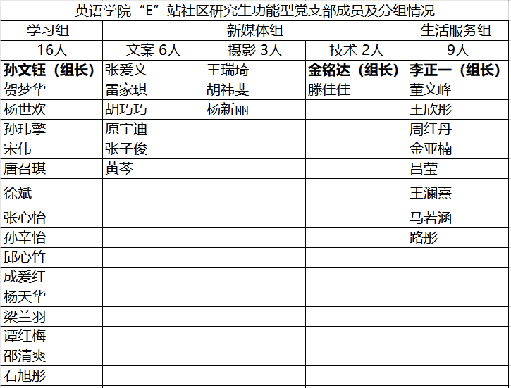 “E”站社区研究生功能性党支部调研与调研环节,这是本次会议的重中之重。支部全体成员针对支部分组、分工及未来可以开展什么样的活动进行了激烈讨论。在韩秀书记和各位党员同学的集思广益下,本支部共分为学习组共16名党员、新媒体组共11名党员(其中新媒体组又分为文案组、摄影组和技术组)和生活服务组共9名党员在内的三个小组。学习组工作性质在于组织日常学习活动,例如每周一次专四答疑活动,这是本支部需要长期坚持的工作。其次学习组可以每月一次组织一些大型活动,例如具有红色主题的配音大赛。新媒体组工作性质分为三类,文案组负责文字工作,摄影组负责每次活动或会议的摄影与图像编辑,技术组主要负责技术运营。生活服务小组工作性质在日常生活技术服务,如备用外用如棉签、创可贴等医疗基础用品为同学们应急使用、修理用品等。