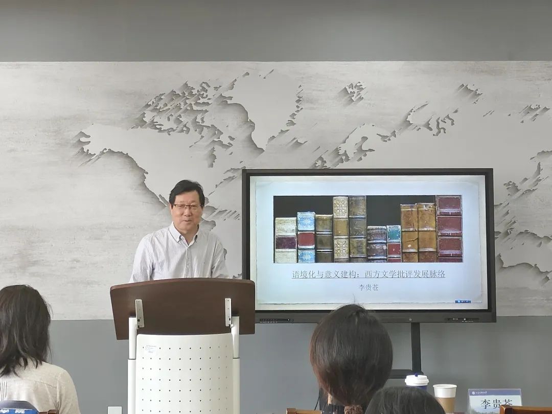 于6月2日邀请大连外国语大学启航学者李贵苍教授在爱尔兰研究中心为师生做了题为“语境化与意义建构:西方文学批评发展脉络”的学术讲座。本次讲座为启航学者新文科研究系列讲座之一,由学院外国文学研究所所长李文萍教授主持,外国文学研究团队成员、部分专任教师、硕士研究生及本科生共同聆听了此次讲座。