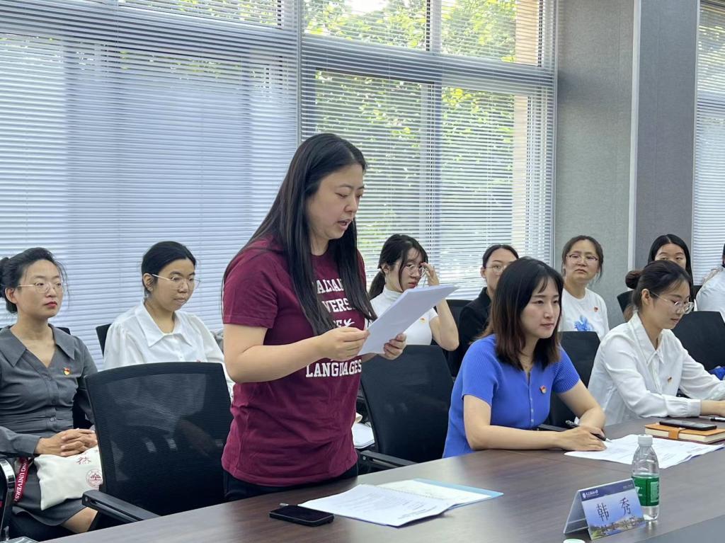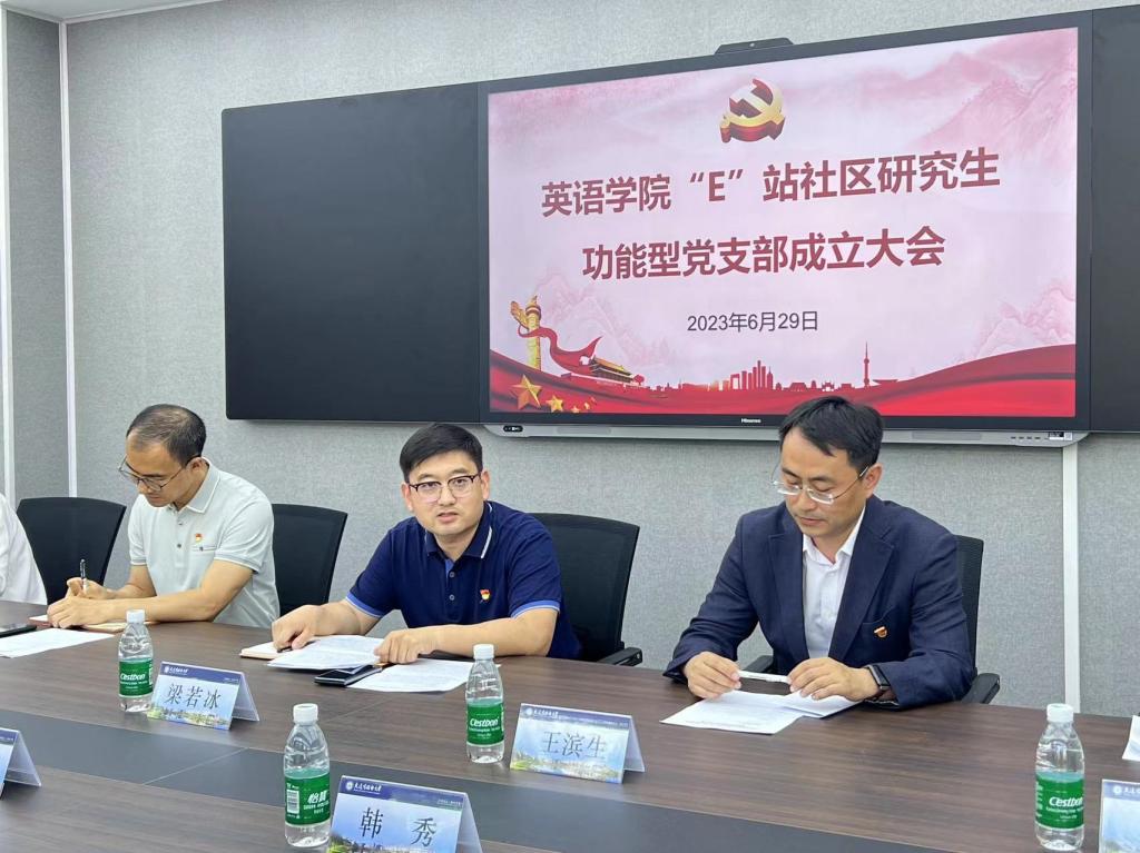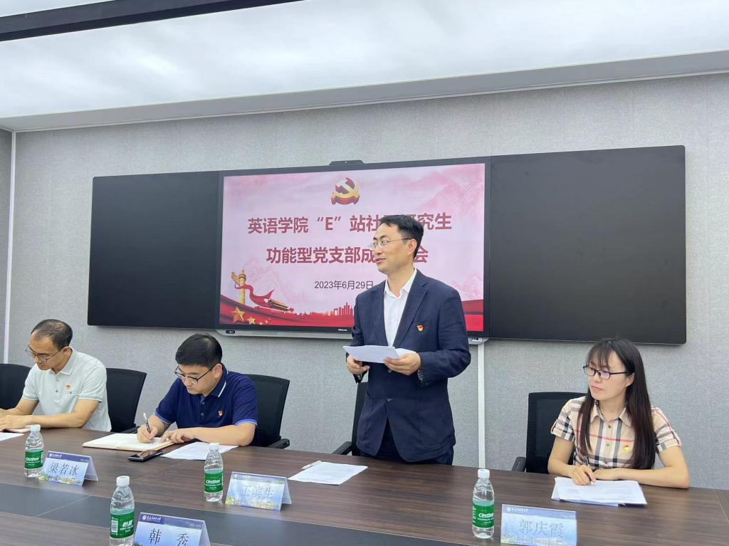 正值中国共产党成立102周年之际,为深入贯彻习近平新时代中国特色社会主义思想和党的二十大精神,落实《大连外国语大学深化党建立德树人服务振兴行动工作方案》内容,探索在“一站式”学生社区创新党组织设置方式,扩大党的组织覆盖范围,在校党委组织部、校党委学生工作部的大力支持和指导下,娱乐游戏平台大全 党委于6月29日11教109会议室举行娱乐游戏平台大全 “E”站社区研究生功能型党支部成立大会。校党委学生工作部大学生网络思想政治教育中心主任王滨生、娱乐游戏平台大全 党委副书记梁若冰、教工第一党支部书记王成东、学院党委委员郭庆霞、“E”站社区研究生功能型党支部书记韩秀、本科生第二党支部书记王艺凝出席,研究生党支部以及功能型党支部成员参加。成立大会由学院研究生党支部书记黄新智主持。