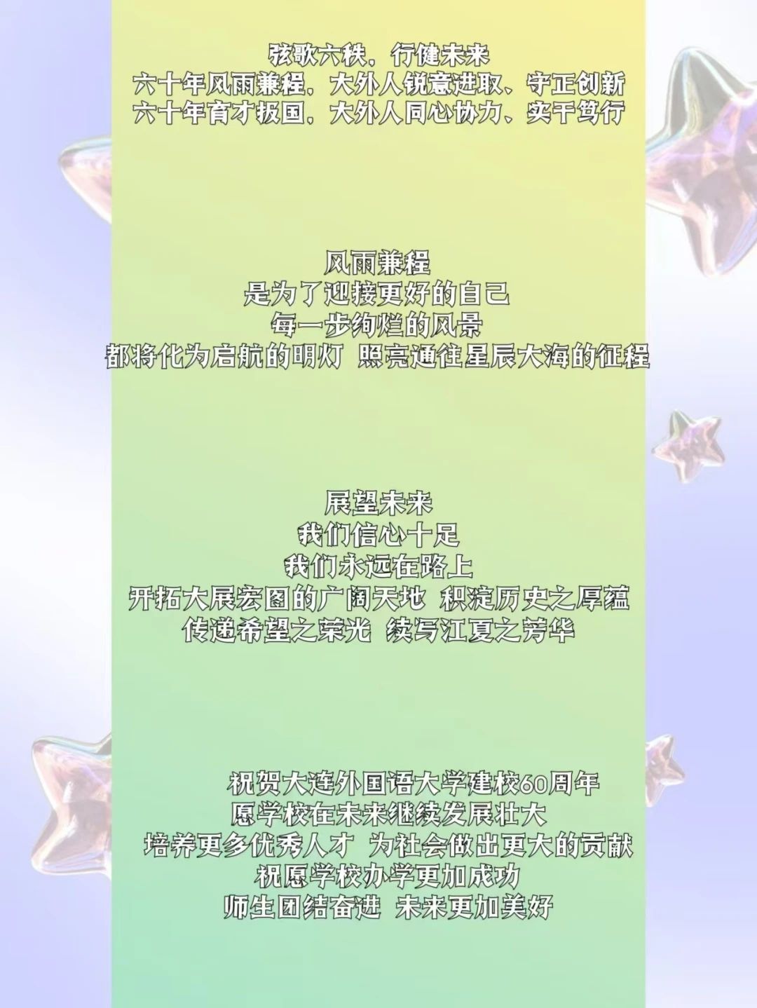 大连外国语大学,您已经走过了六十年的辉煌历程。在您的生日来临之际,我们衷心祝愿您繁荣昌盛,再创辉煌。愿您的学子们都能在这里收获知识,实现梦想。生日快乐!