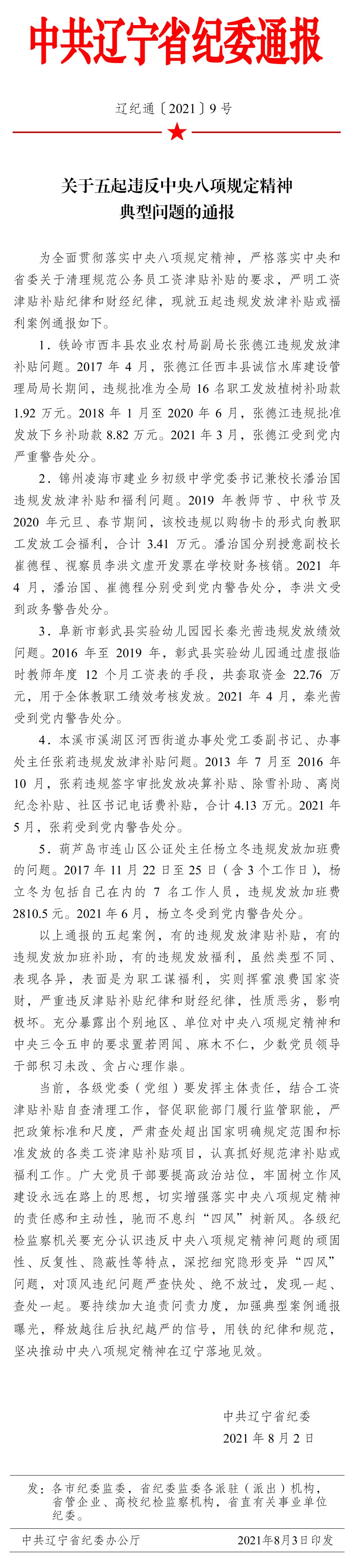 以案为鉴第十一期:中共辽宁省纪委关于五起违反中央八项规定精神典型问题的通报